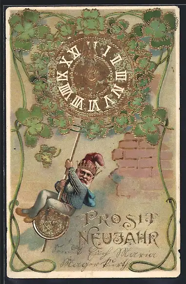 AK Prosit Neujahr, Zwerg schaukelt auf einem Pendel, Uhr, Klee