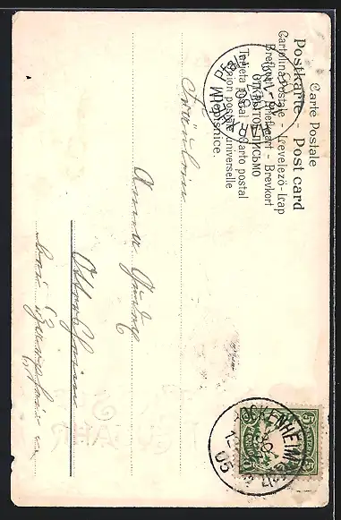 alte Ansichtskarte, gelaufen 1905, Eckknicke oben, Kantenschaden re. unten, guter Zustand