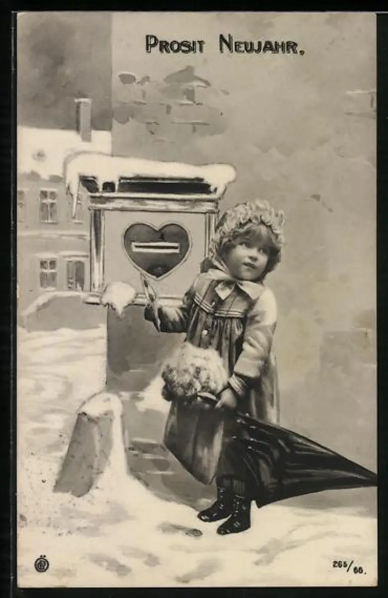 AK Prosit Neujahr, kleines Mädchen wirft einen Brief in den Briefkasten