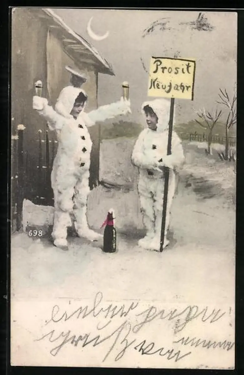 AK Prosit Neujahr, zwei Kinder in Schneemannkostümen mit Sektgläsern
