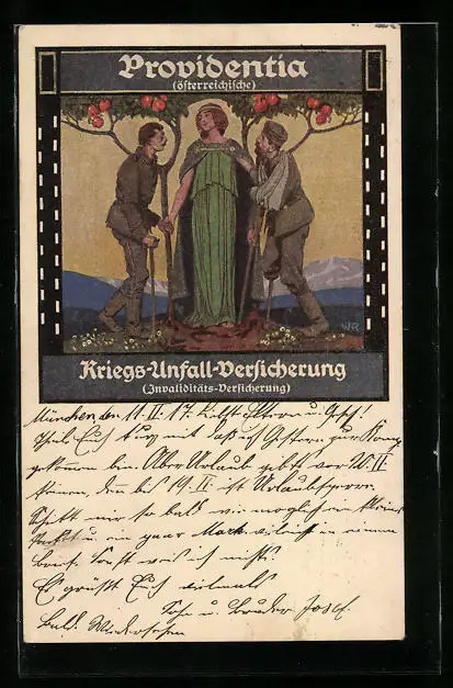 AK Providentia, österr. Kriegs-Unfall-Versicherung, Invalidenversicherung, Invaliden mit Göttin am Ortsrand