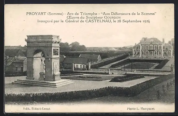 AK Proyart, Arc de Triomphe Aux Défenseurs de la Somme inauguré le 28 septembre 1924