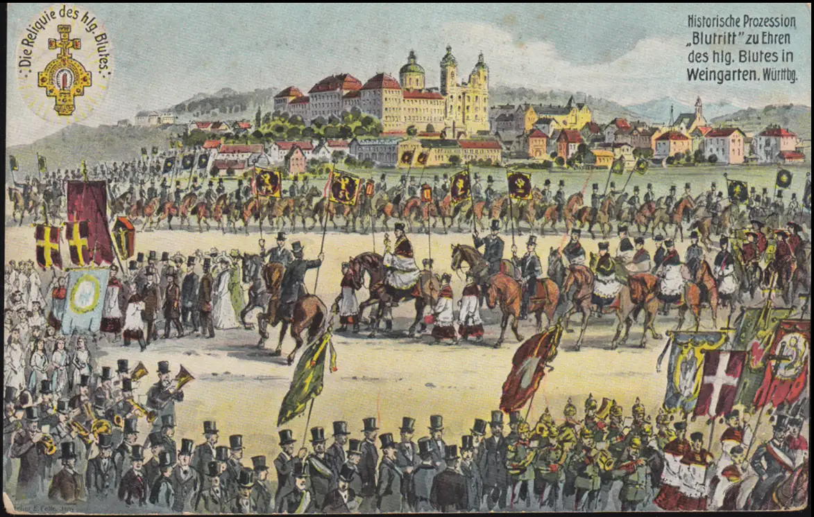Künstler-Ansichtskarte Historische Prozession "Blutritt" zu Ehren des heiligen Blutes in Weingarten / Württemberg