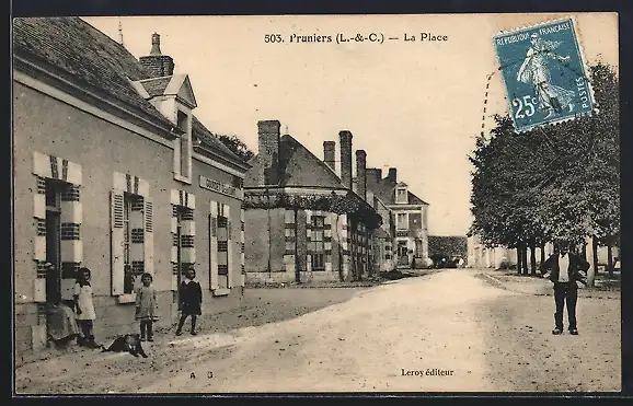 AK Pruniers, La Place avec des enfants jouant et des maisons alignées