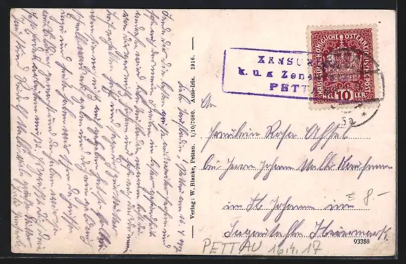 Personenbezogene Daten auf der Rückseite der Karte wurden durch blauen Textmarker unkenntlich gemacht. Die blauen Stellen sind auf die Vorderseite durchgeweicht und wirken sich negativ auf das Postkartenfoto aus