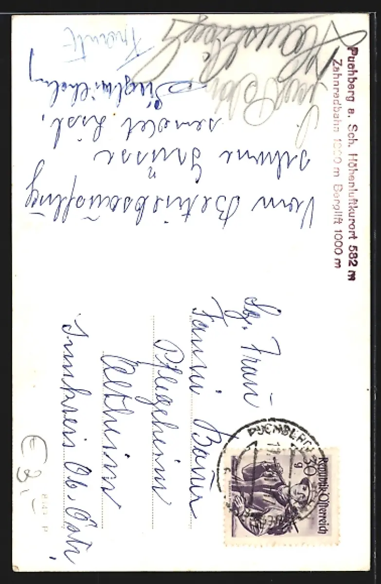 Personenbezogene Daten auf der Rückseite der Karte wurden durch blauen Textmarker unkenntlich gemacht. Die blauen Stellen sind auf die Vorderseite durchgeweicht und wirken sich negativ auf das Postkartenfoto aus