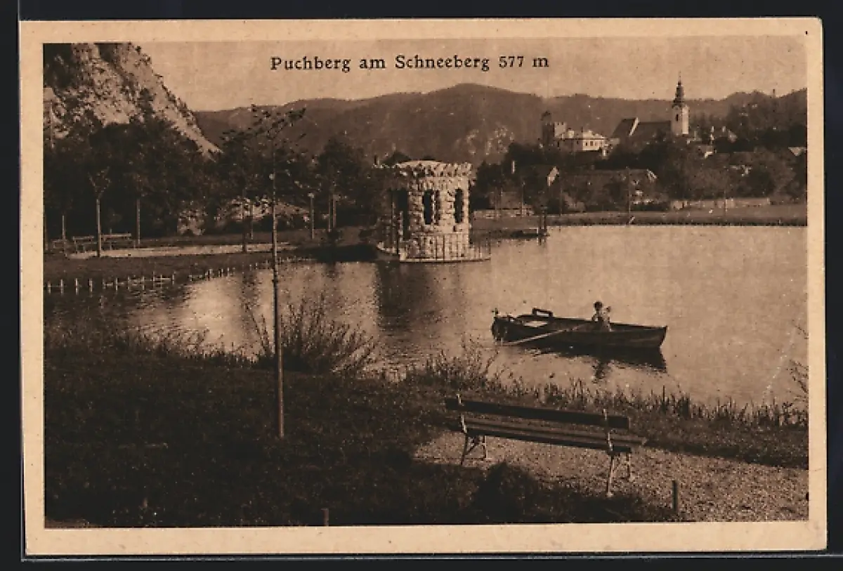 AK Puchberg am Schneeberg, Wasserpartie mit Ruderer und Blick zur Kirche