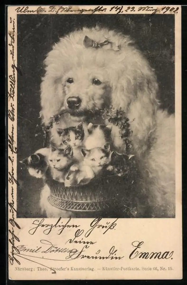 AK Pudel trägt einen Korb voller Kätzchen in der Schnauze