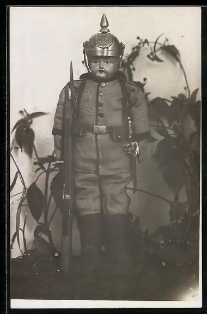 AK Puppe in deutscher Soldatenuniform mit Pickelhaube, Bajonett und Gewehr