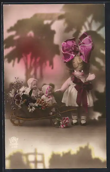 AK Puppe mit zwei Puppenkindern in einer Schubkarre