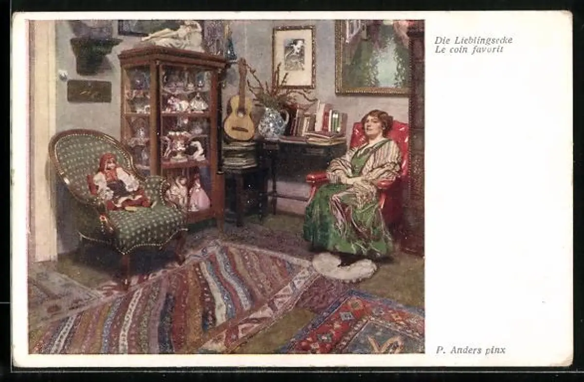 AK Puppen in Vitrine und auf Sessel