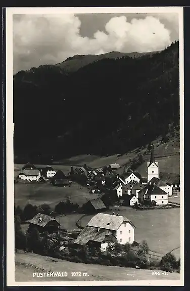 AK Pusterwald, Ortsansicht mit Kirche aus der Vogelschau