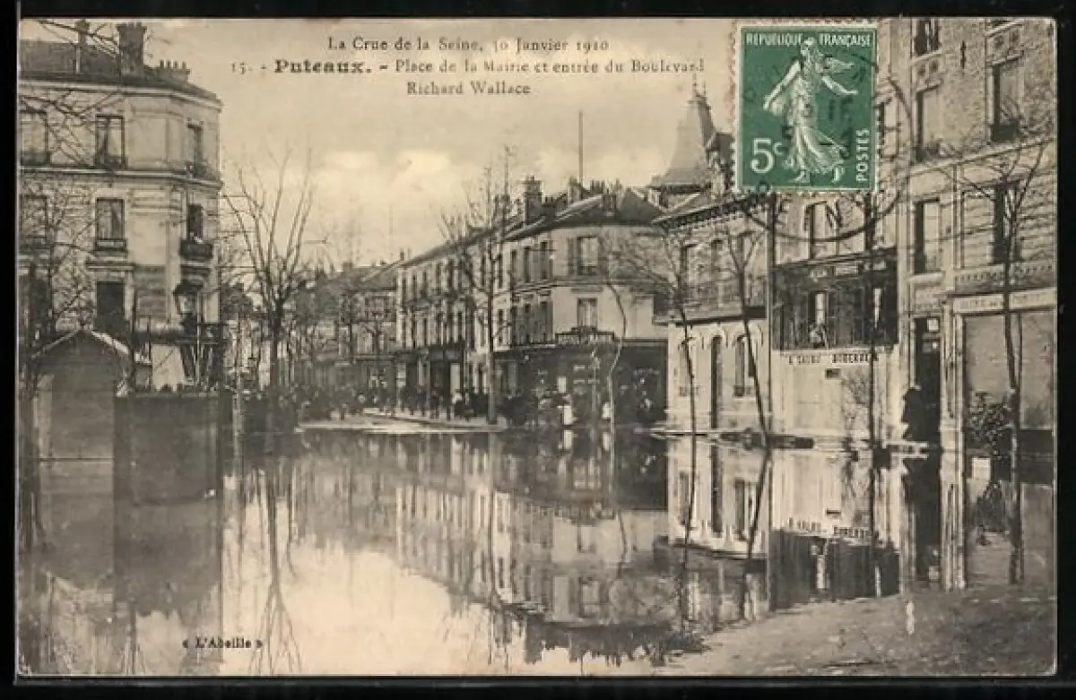 AK Puteaux, Inondation de la Seine 1910, Place de la Mairie et boulevard Richard Wallace