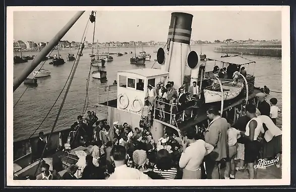 AK Quiberon, Embarquement à Port-Maria pour Belle-Île avec vue sur les bateaux et passagers à bord