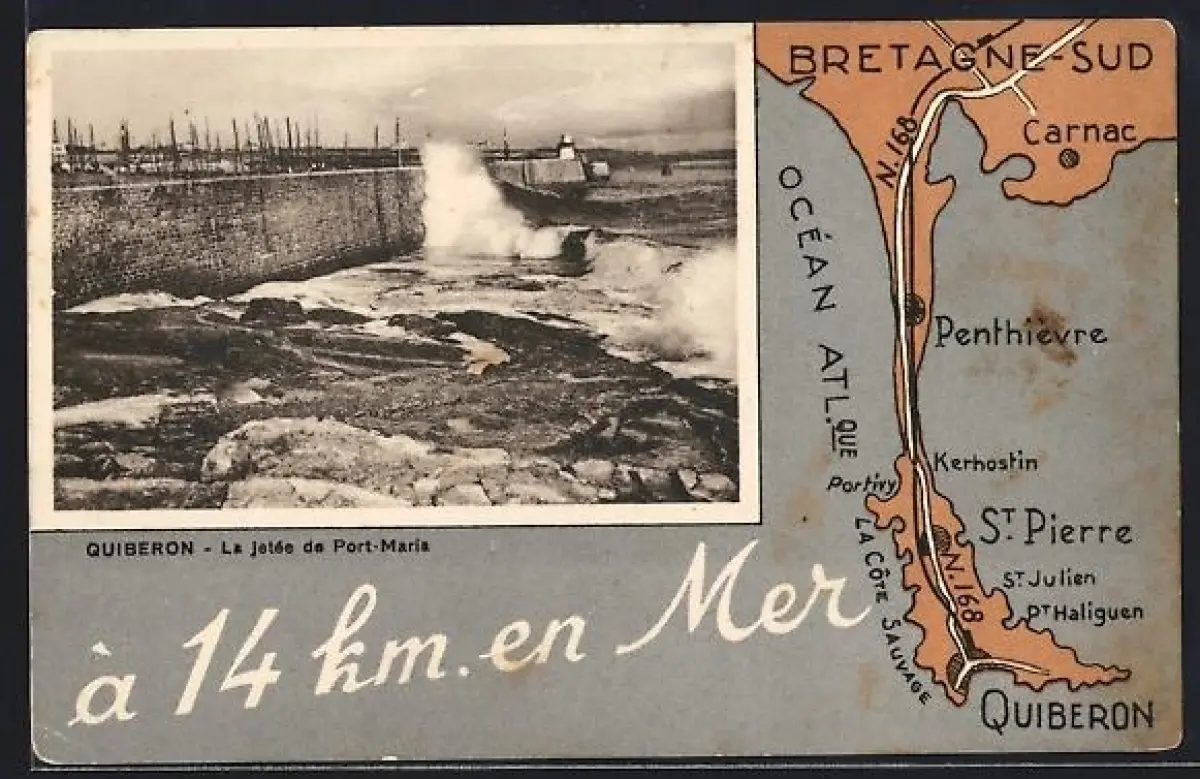 AK Quiberon, La jetée de Port-Maria et carte de la région Bretagne Sud