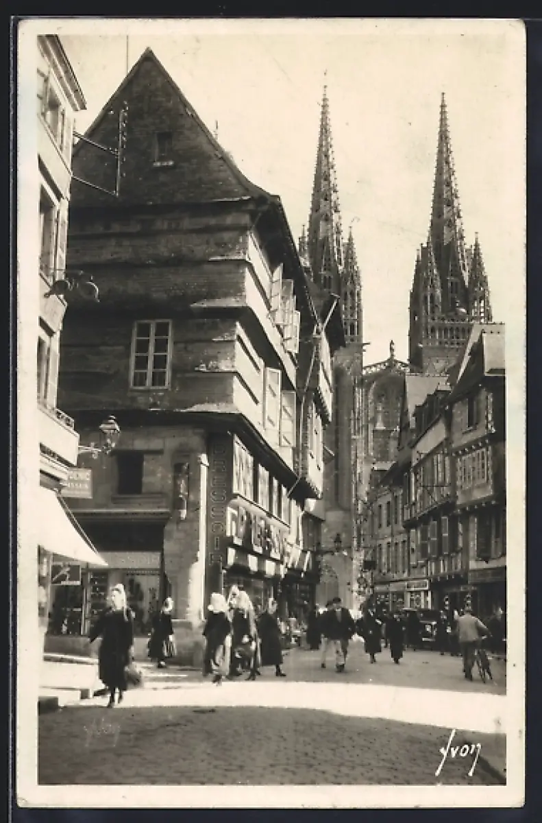 AK Quimper, Rue animée avec vue sur les flèches de la cathédrale