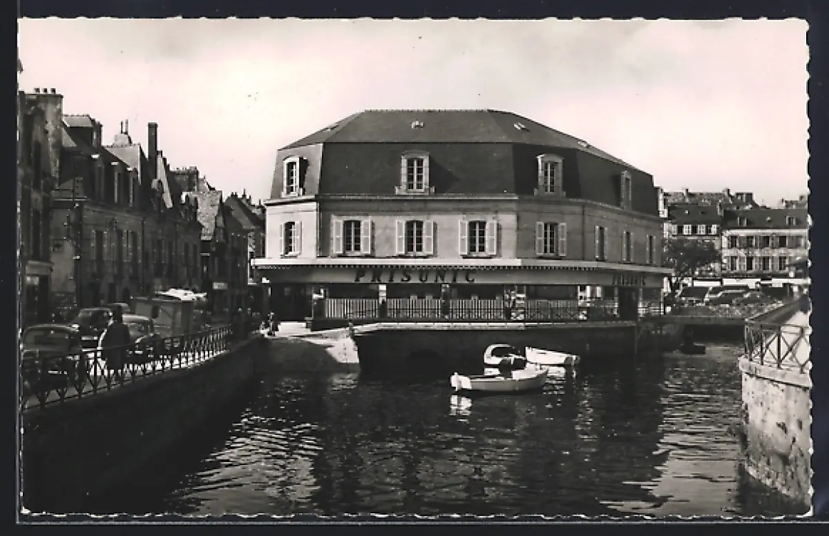 AK Quimper, Vue du bâtiment au bord de l`eau avec bateau et voitures
