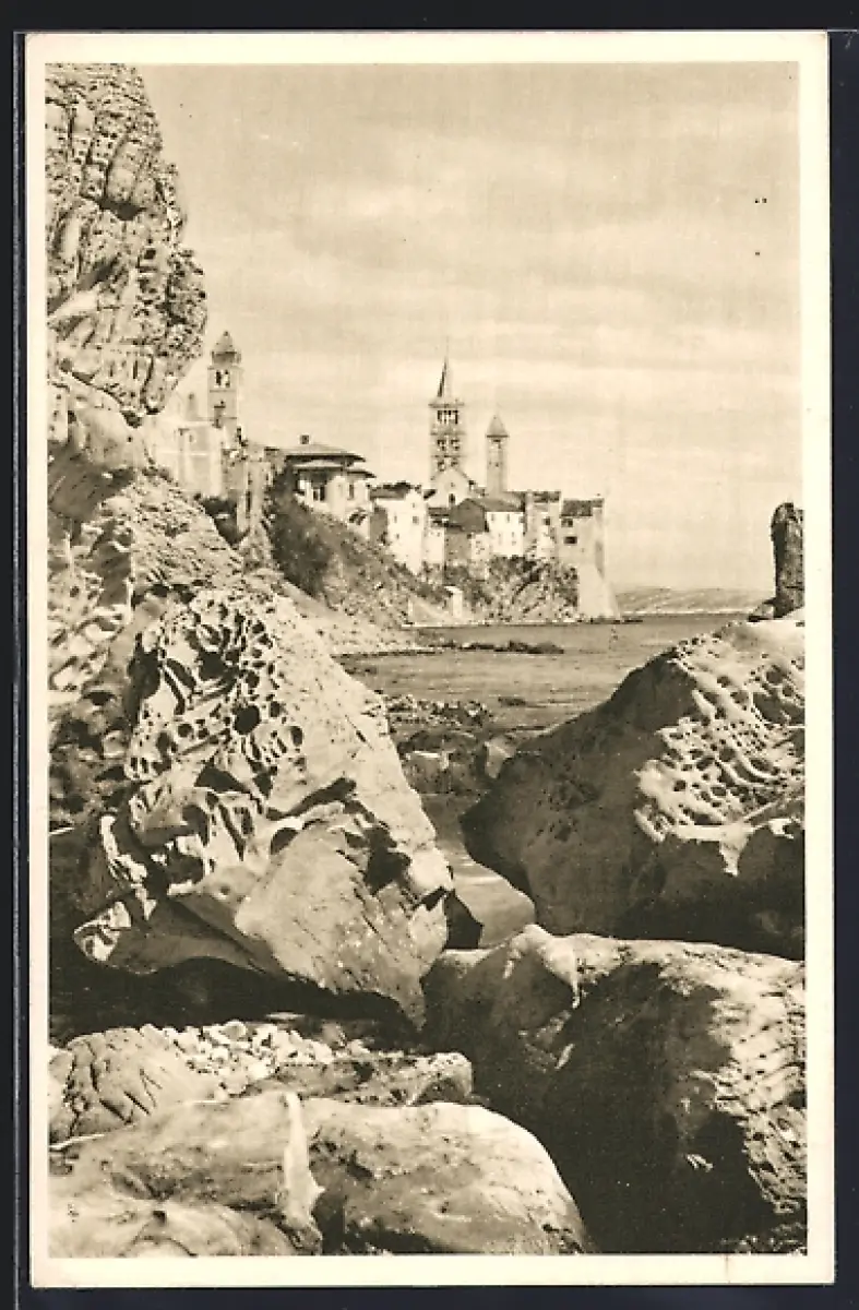 AK Rab /Dalmacija, Strand mit Blick auf den Ort