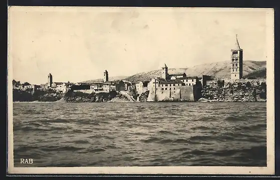 AK Rab, Ortsansicht mit vier Türmen vom Wasser aus