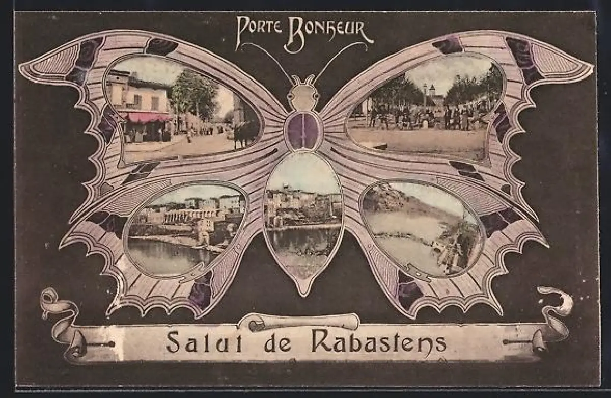 AK Rabastens, Porte Bonheur, scènes diverses dans un papillon décoratif