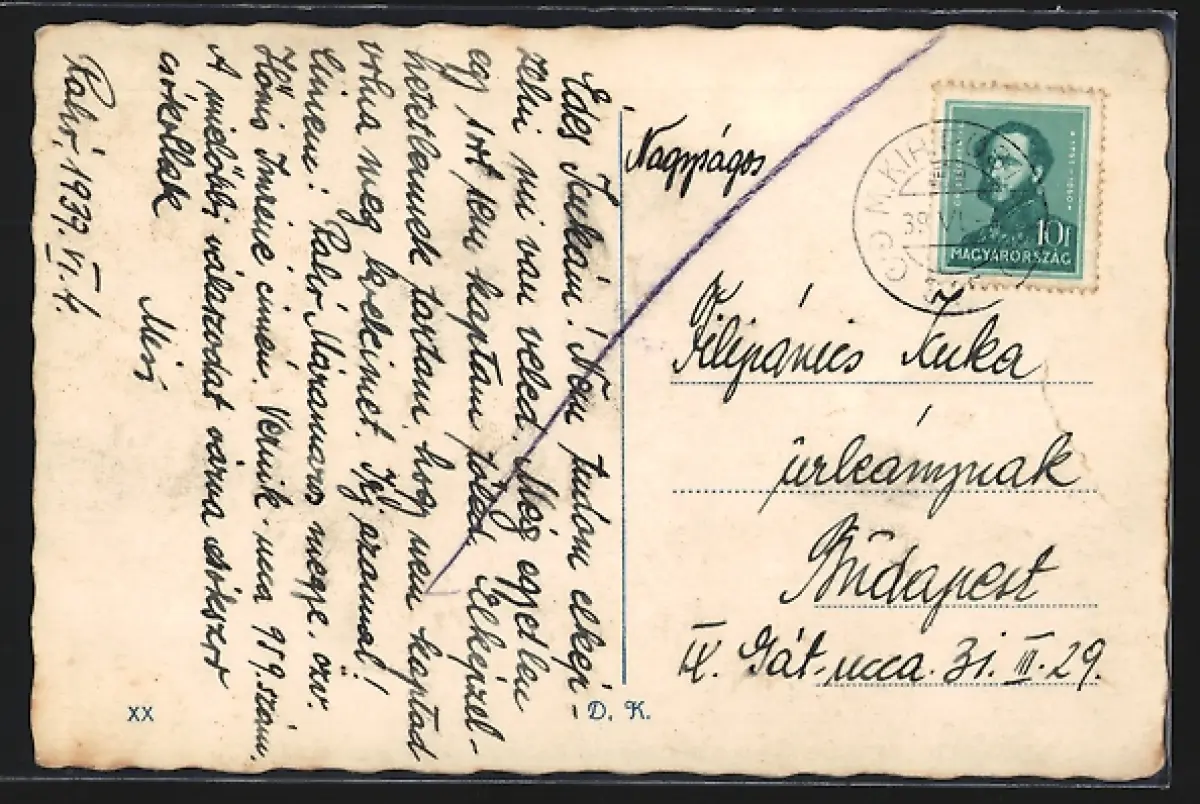 Personenbezogene Daten auf der Rückseite der Karte wurden durch blauen Textmarker unkenntlich gemacht. Die blauen Stellen sind auf die Vorderseite durchgeweicht und wirken sich negativ auf das Postkartenfoto aus