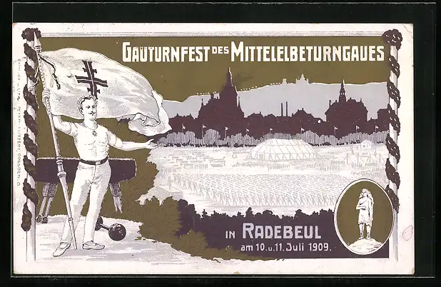 AK Radebeul, Gauturnfest des Mittelelbeturngaus 1909, Turner mit Flagge und turnende Menge auf grossem Platz
