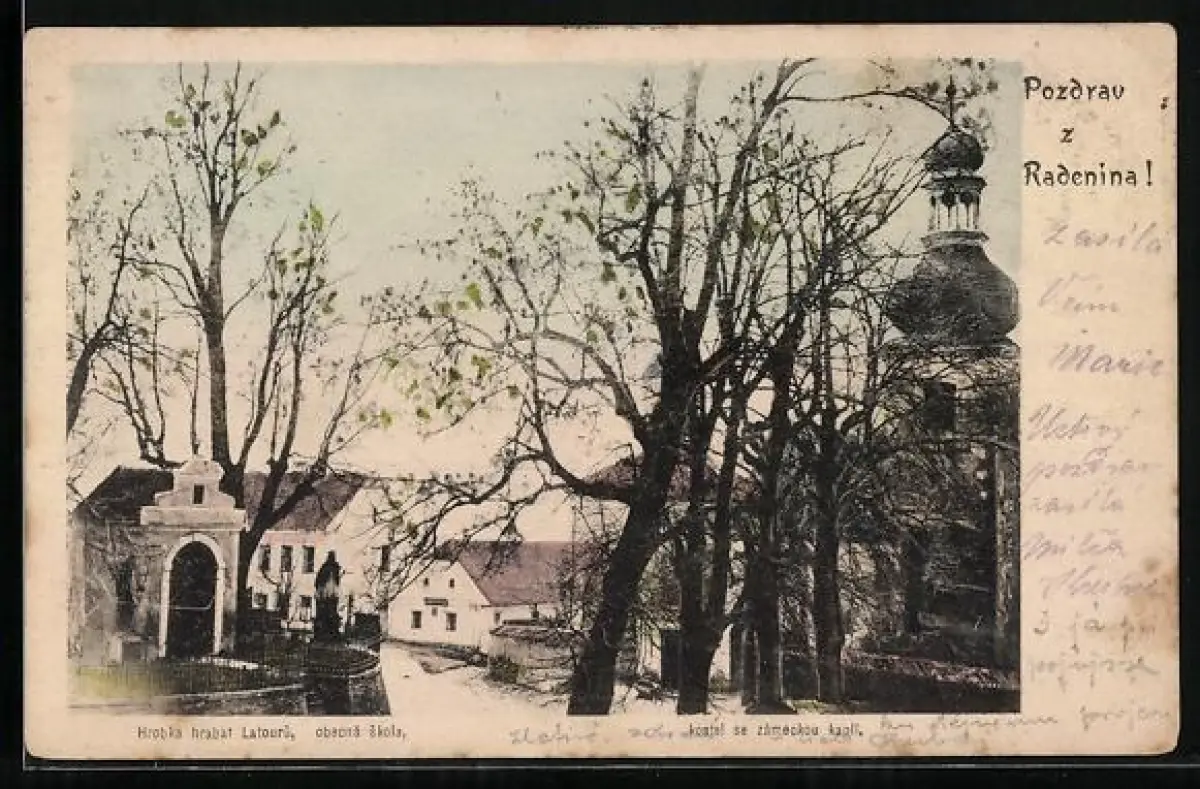 AK Radenina, Hrobka hrabat, obecná skola, kostel se zámeckou kapli