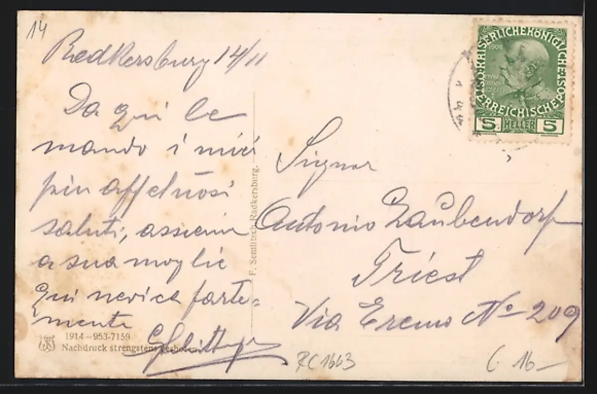 Personenbezogene Daten auf der Rückseite der Karte wurden durch blauen Textmarker unkenntlich gemacht. Die blauen Stellen sind auf die Vorderseite durchgeweicht und wirken sich negativ auf das Postkartenfoto aus
