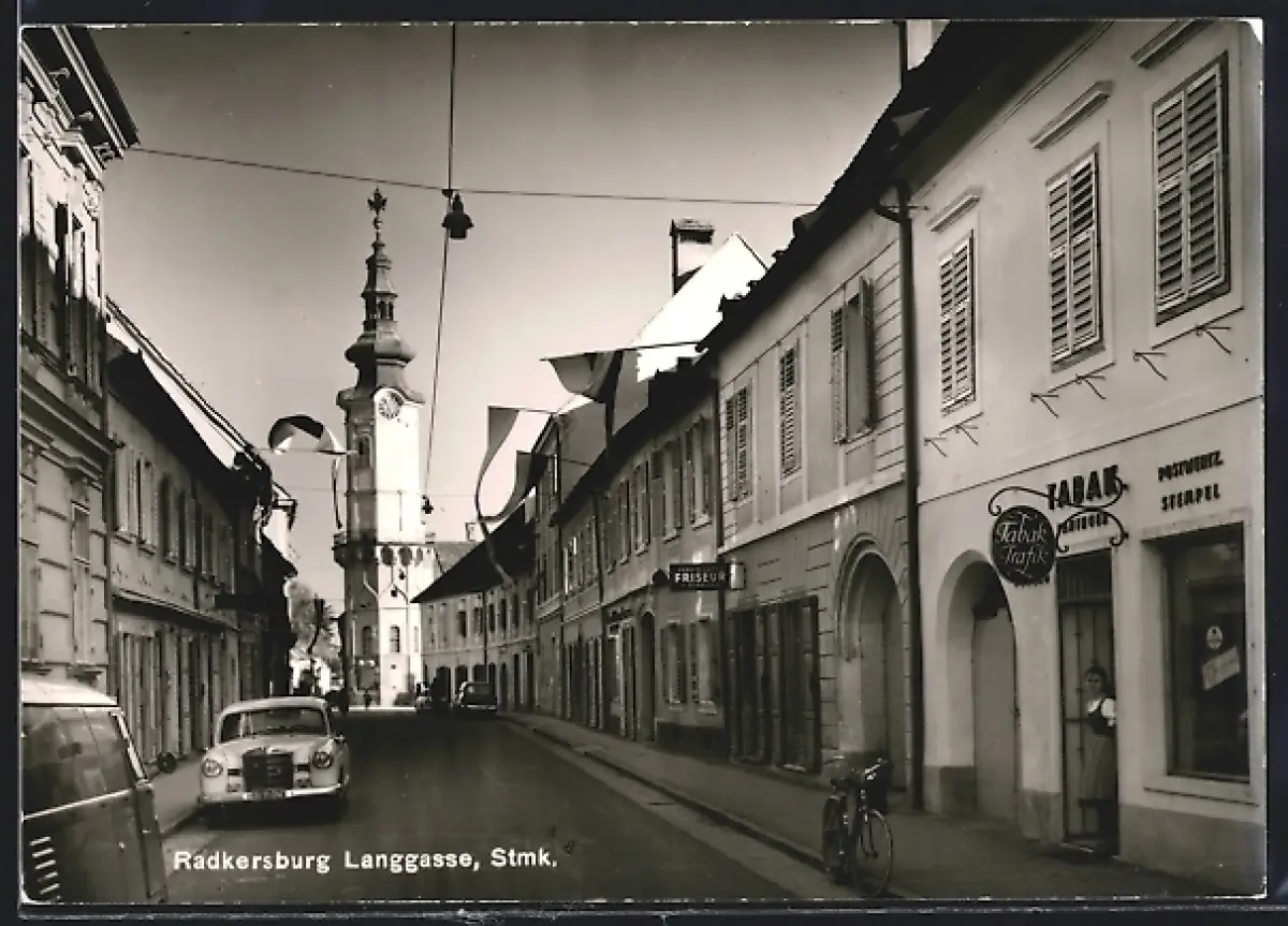 AK Radkersburg /Stmk., Strasse Langgasse mit Tabakladen und Kirche