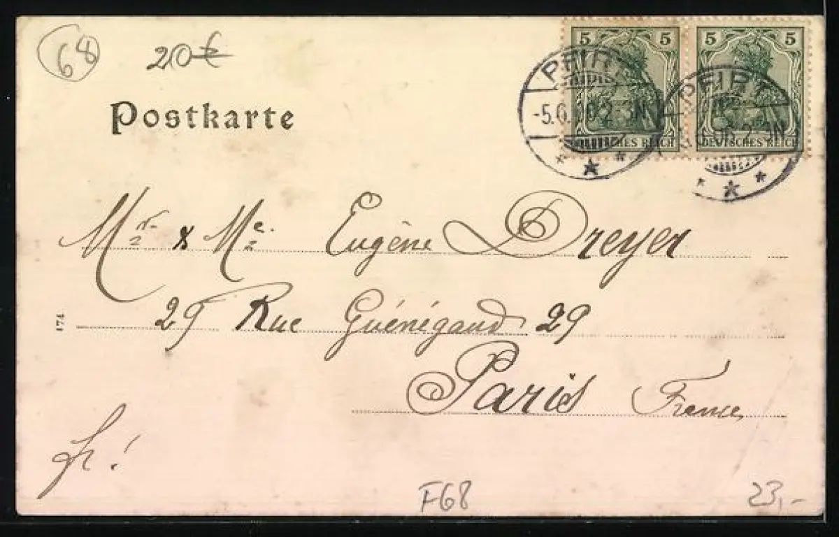 alte Ansichtskarte, gelaufen 1900, Eckknicke unten, Eckknick rechts oben, guter Zustand