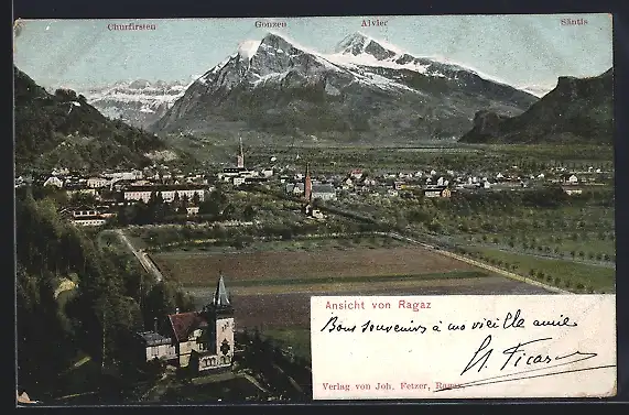 AK Ragaz, Ansicht gegen Churfirsten, Gonzen, Alvier und Säntis