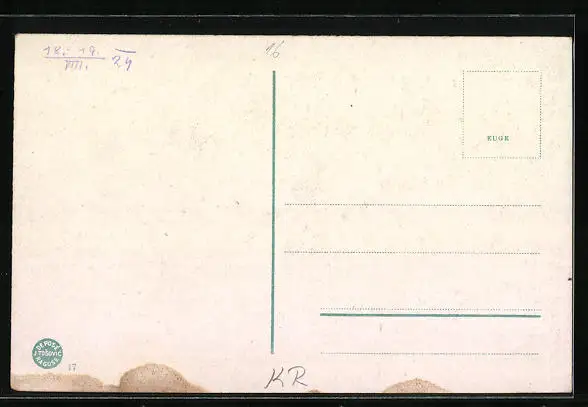 Personenbezogene Daten auf der Rückseite der Karte wurden durch blauen Textmarker unkenntlich gemacht. Die blauen Stellen sind auf die Vorderseite durchgeweicht und wirken sich negativ auf das Postkartenfoto aus