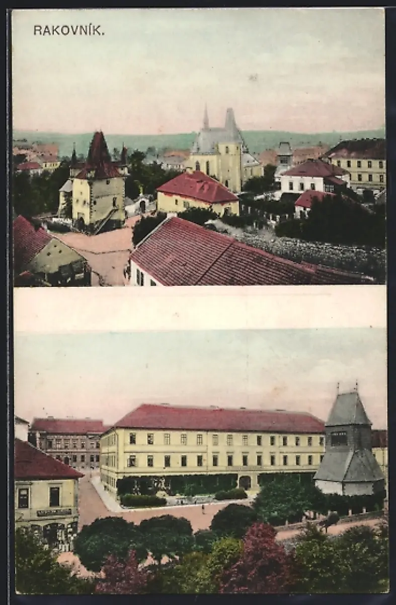 AK Rakovnik, Platz mit Turm, Teilansicht aus der Vogelschau