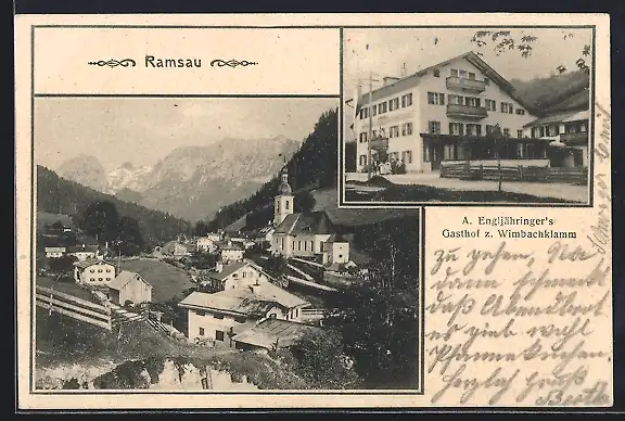 AK Ramsau / Berchtesgaden, Gasthof zum Wimbachklamm, Stadtansicht mit Kirche