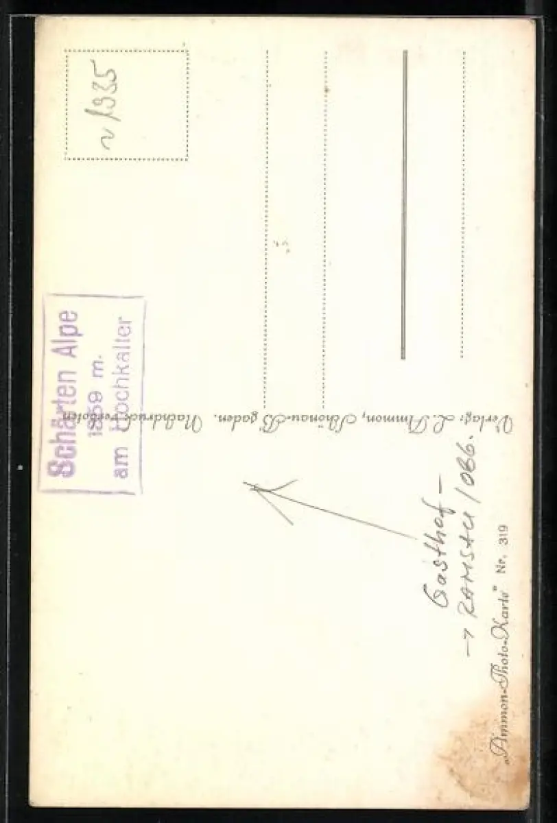 Personenbezogene Daten auf der Rückseite der Karte wurden durch blauen Textmarker unkenntlich gemacht. Die blauen Stellen sind auf die Vorderseite durchgeweicht und wirken sich negativ auf das Postkartenfoto aus
