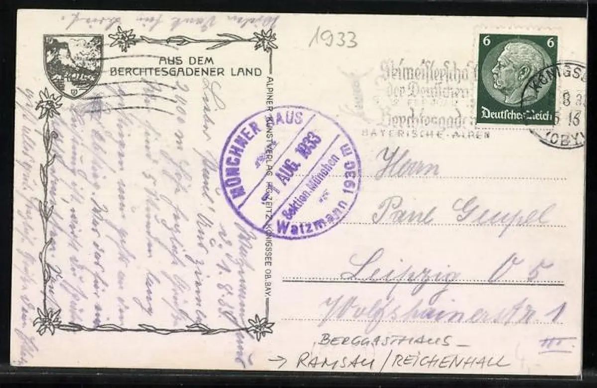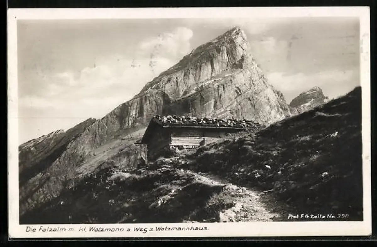 AK Ramsau /Reichenhall, Berggasthaus Falzalm mit kleinem Watzmann am Weg zum Watzmannhaus