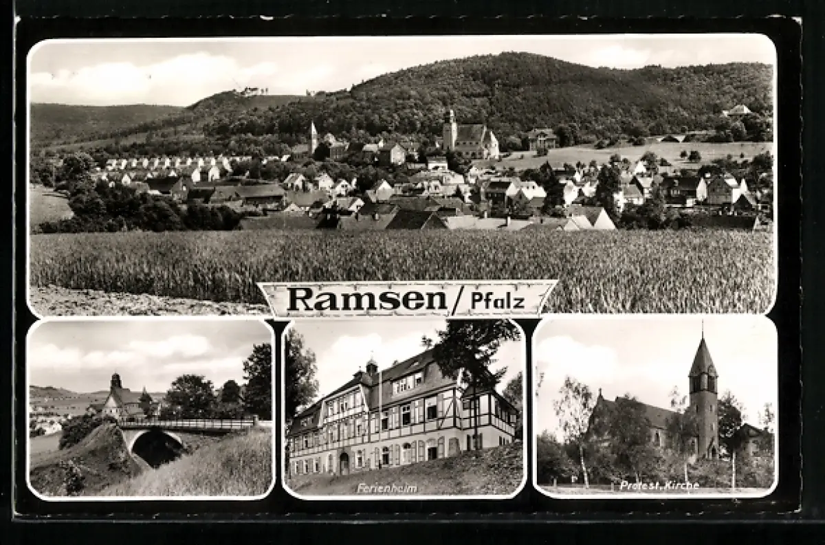 AK Ramsen /Pfalz, Totalansicht, Ferienheim und Protestantische Kirche