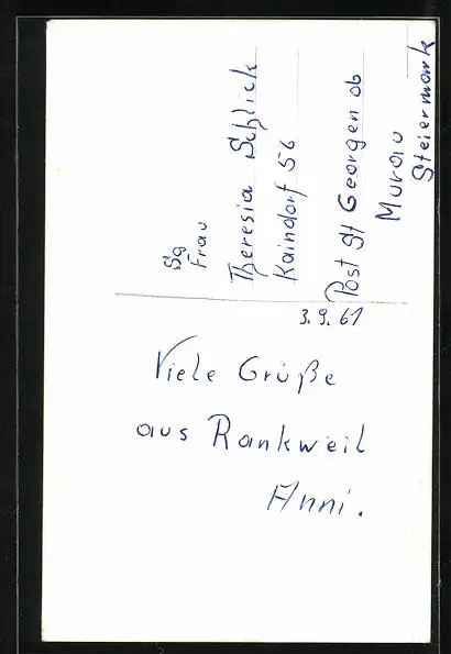 Personenbezogene Daten auf der Rückseite der Karte wurden durch blauen Textmarker unkenntlich gemacht. Die blauen Stellen sind auf die Vorderseite durchgeweicht und wirken sich negativ auf das Postkartenfoto aus