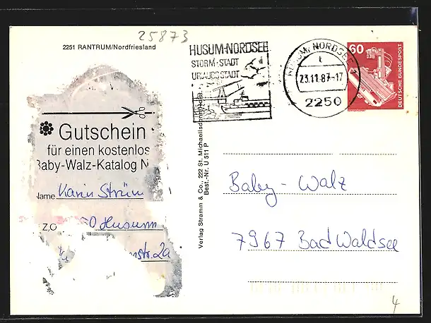 alte Ansichtskarte, gelaufen 1987, rückseitig Klebe- und Papierreste, guter Zustand