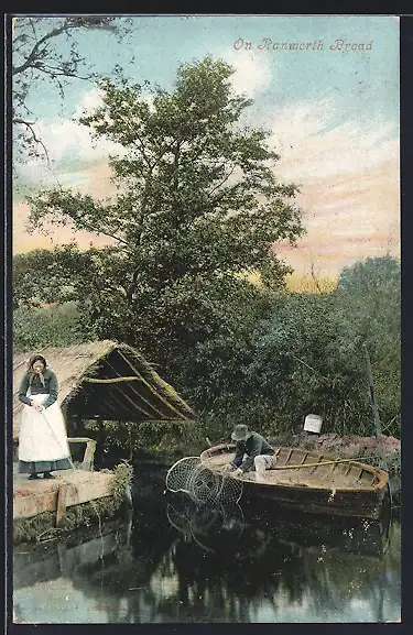 AK Ranworth, View of the Broad, Fischer holt Reuse ins Boot