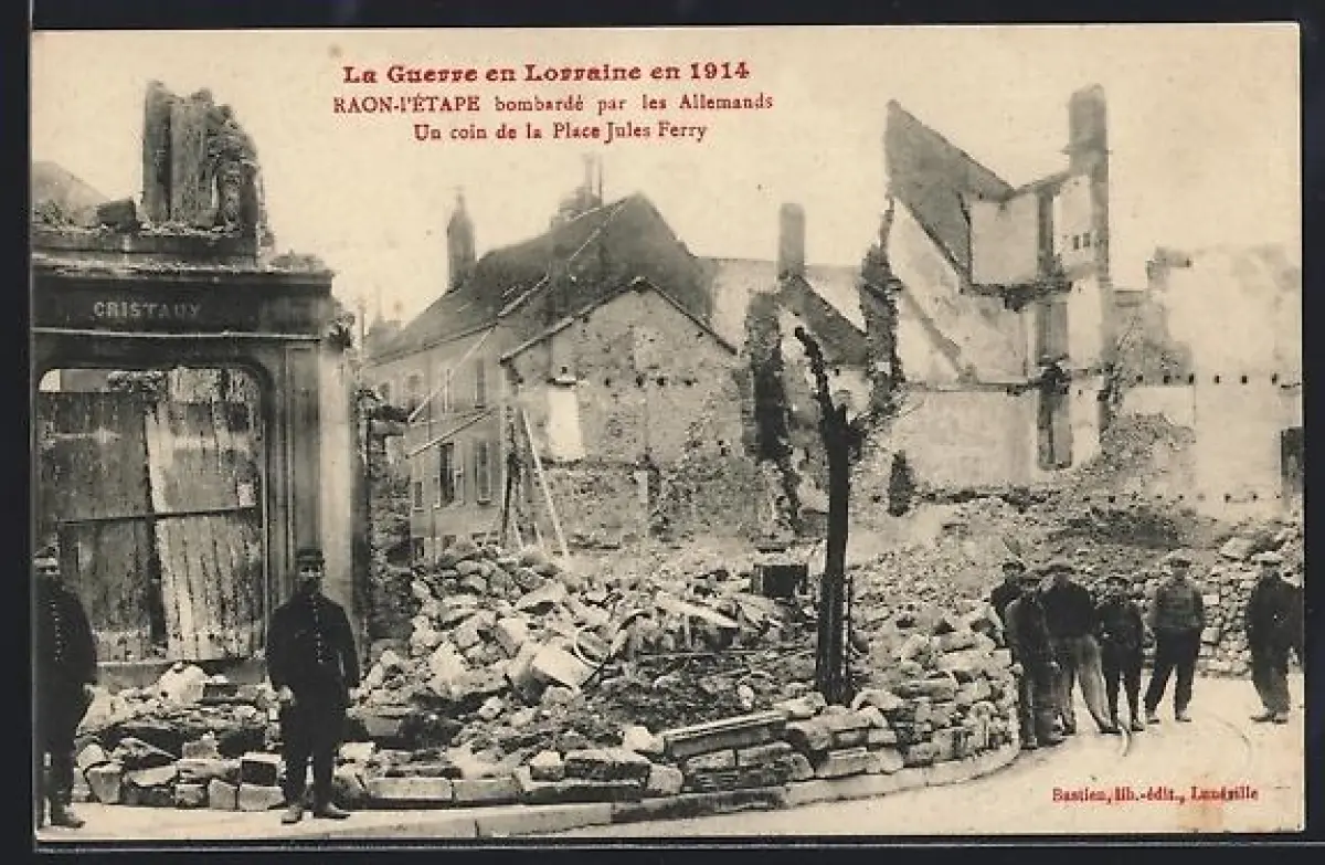 AK Raon-l`Étape, Bombardé par les Allemands, un coin de la Place Jules Ferry