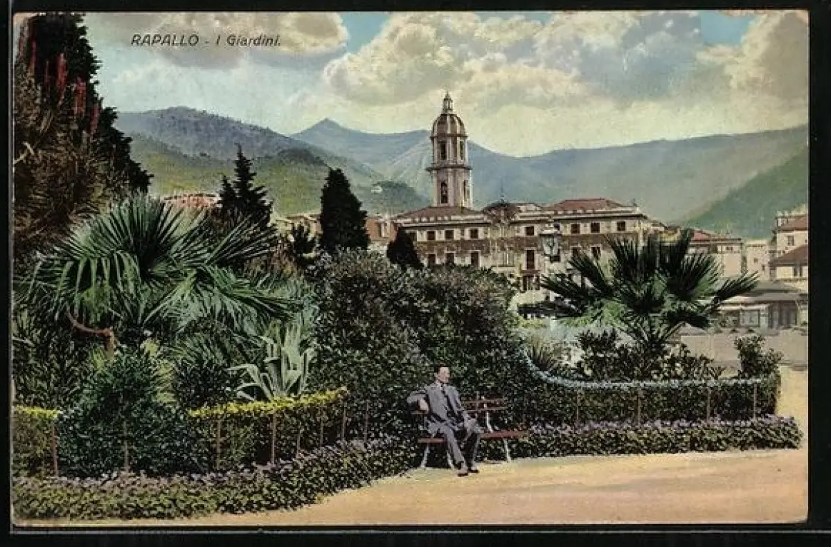 AK Rapallo, I Giardini, Mann auf einer Parkbank