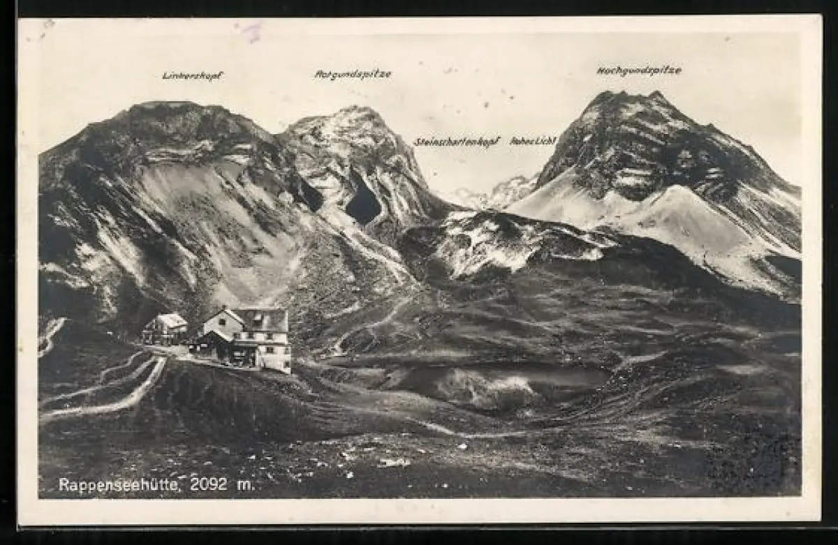 AK Rappenseehütte, Berghütte mit Rotgundspitze, Hochgundspitze und Linkerskopf