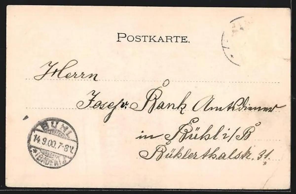 alte Ansichtskarte, gelaufen 1900, Briefmarke entfernt, Eckknicke li., Bugspur li. unten, minimaler Einriss li. oben, guter Zustand