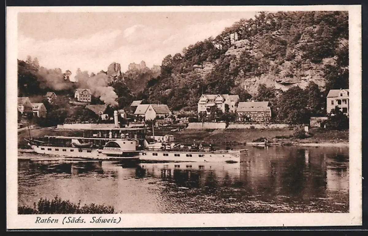 AK Rathen, Ortsansicht mit Passagierdampfschiff Habsburg auf der Elbe