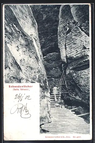 AK Rathen /Sächs. Schweiz, Schwedenlöcher, Besucher am Aufstieg