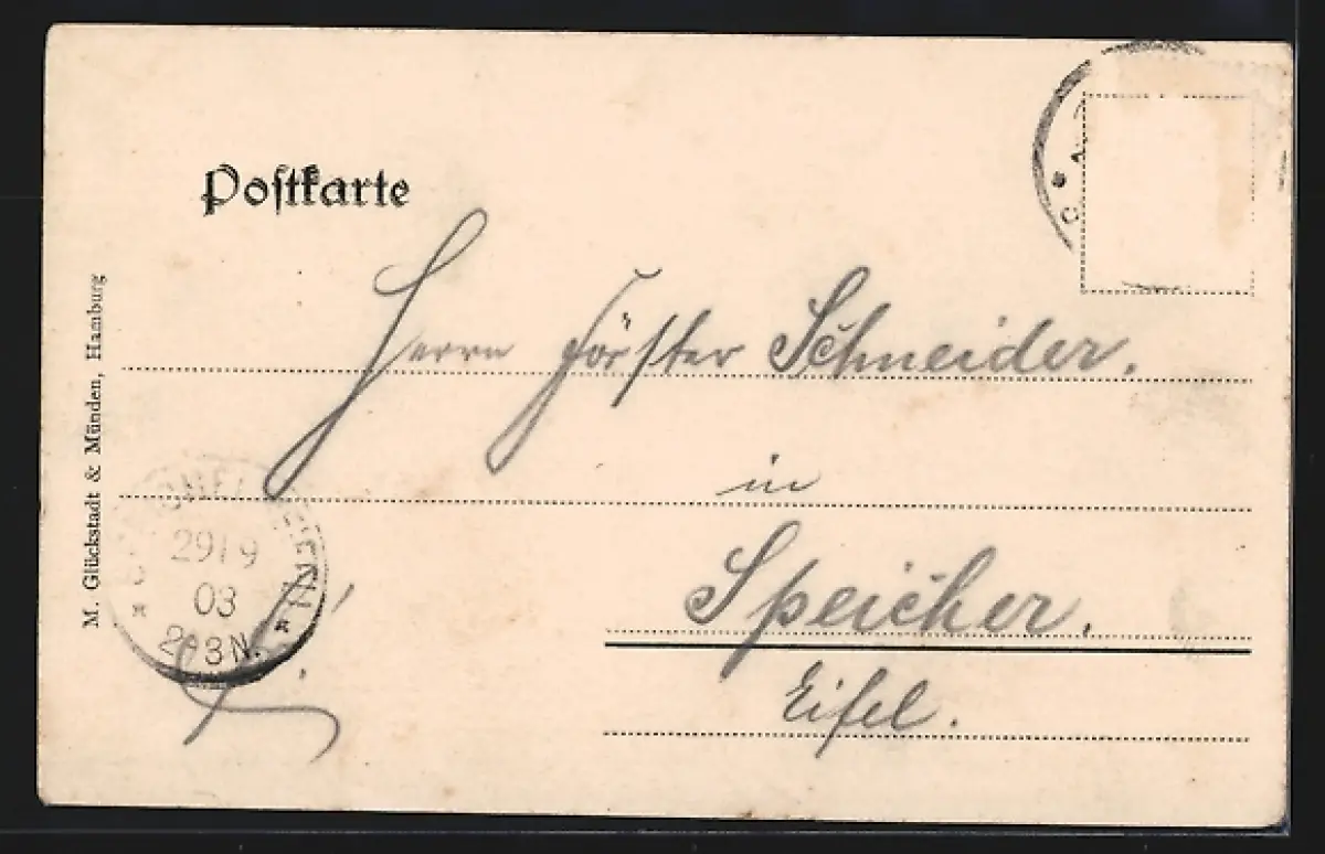 alte Ansichtskarte, gelaufen 1903, Briefmarke entfernt, rückseitig Oberflächenschaden, guter Zustand