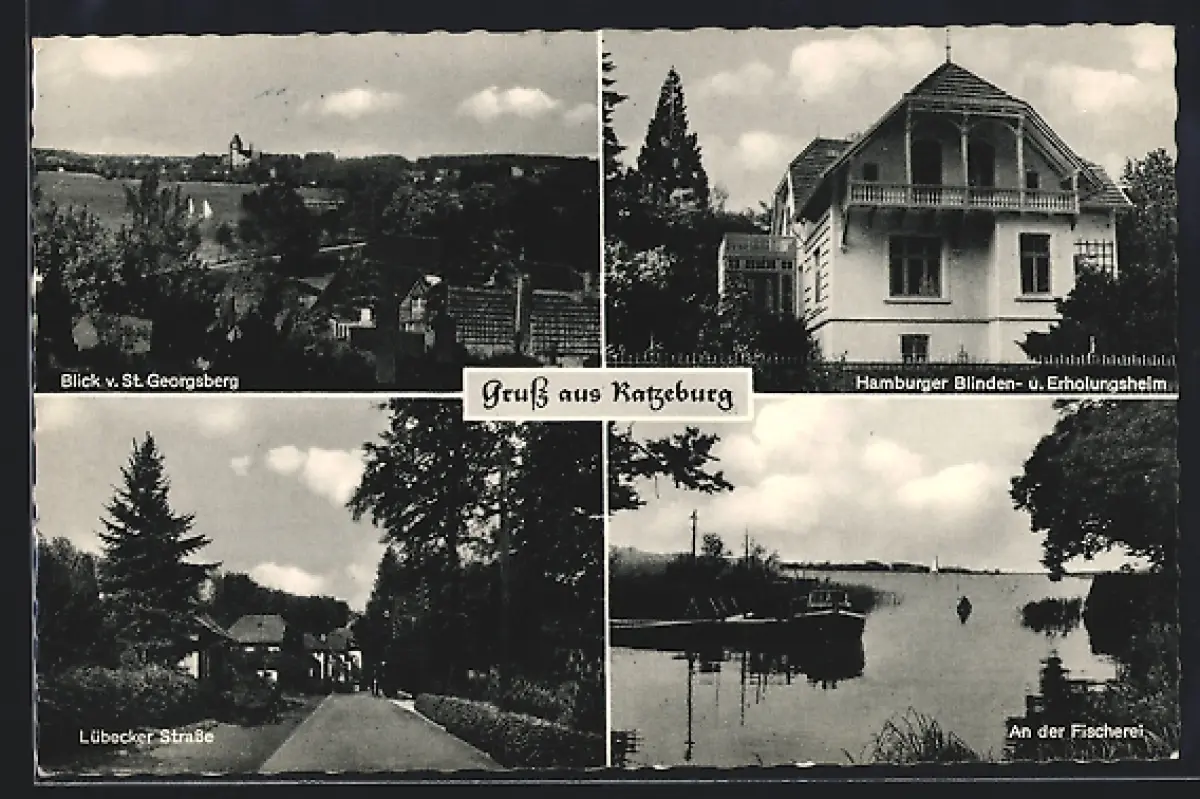 AK Ratzeburg, Blick v. St. Georgsberg, Hamburger Blinden- u. Erholungsheim, Lübecker Strasse, an der Fischerei