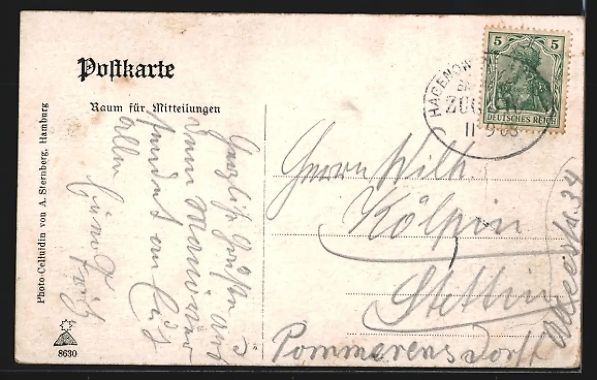 Personenbezogene Daten auf der Rückseite der Karte wurden durch blauen Textmarker unkenntlich gemacht. Die blauen Stellen sind auf die Vorderseite durchgeweicht und wirken sich negativ auf das Postkartenfoto aus