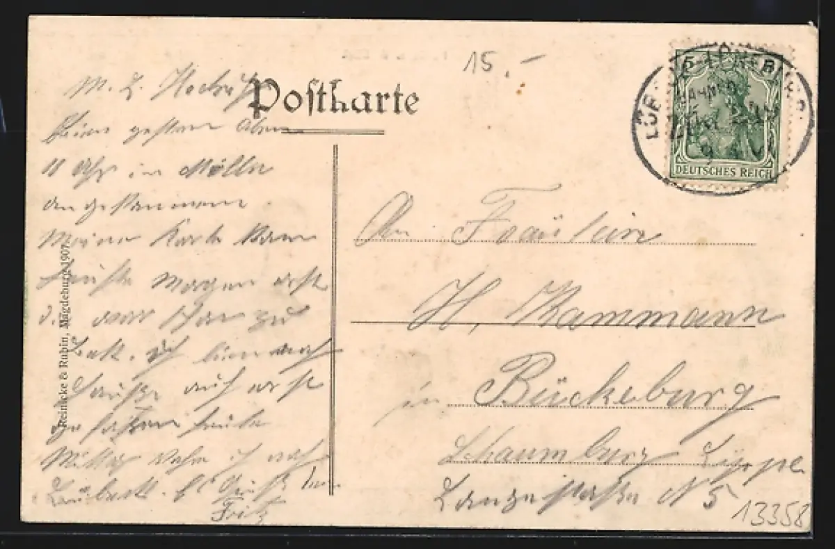 Personenbezogene Daten auf der Rückseite der Karte wurden durch blauen Textmarker unkenntlich gemacht. Die blauen Stellen sind auf die Vorderseite durchgeweicht und wirken sich negativ auf das Postkartenfoto aus